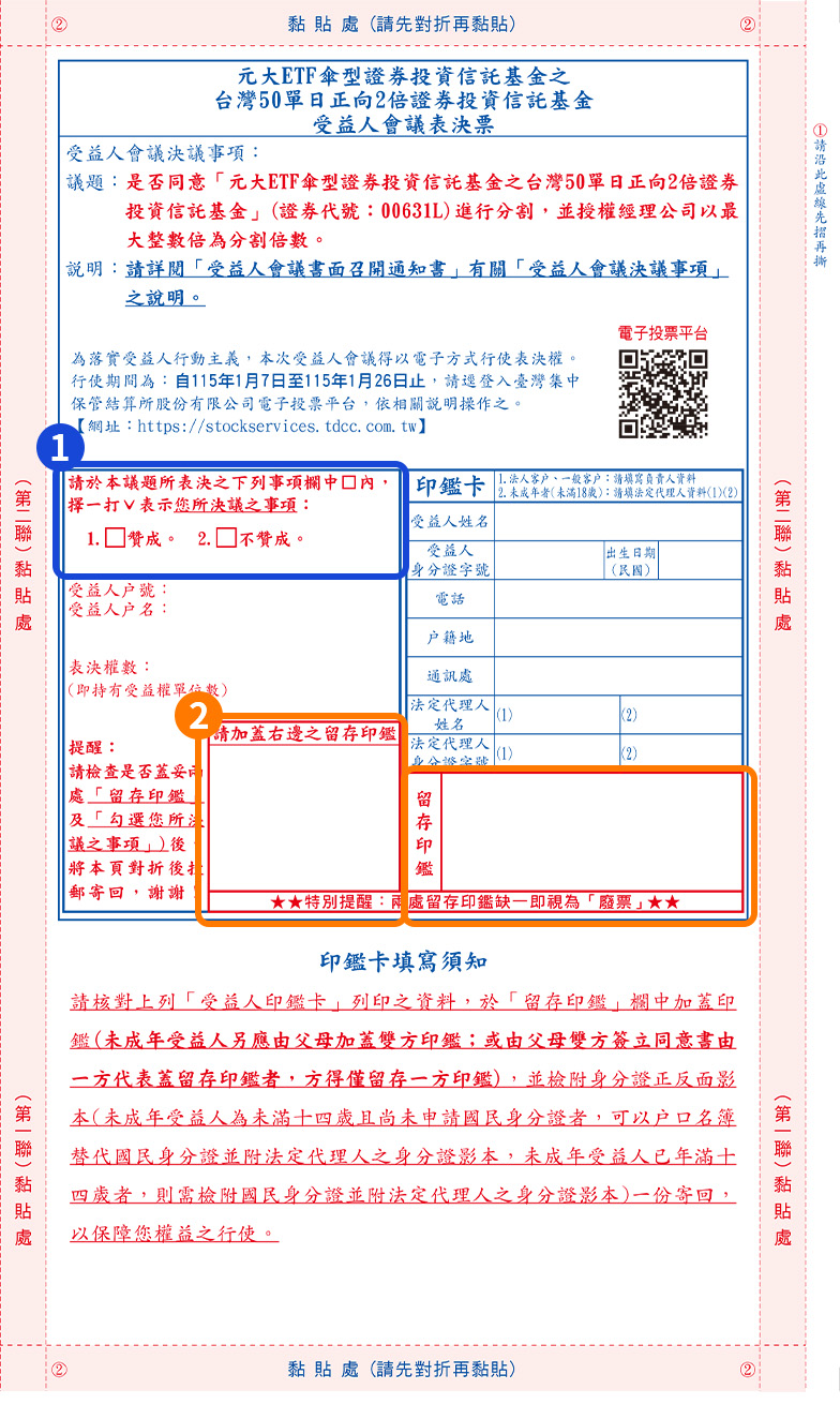受益人會議通知書如下示意,於表決票頁面勾選贊成或不贊成,並於兩處印鑑留存處蓋章,彌封後直接投遞郵筒寄回(免貼郵票),即完成投票。