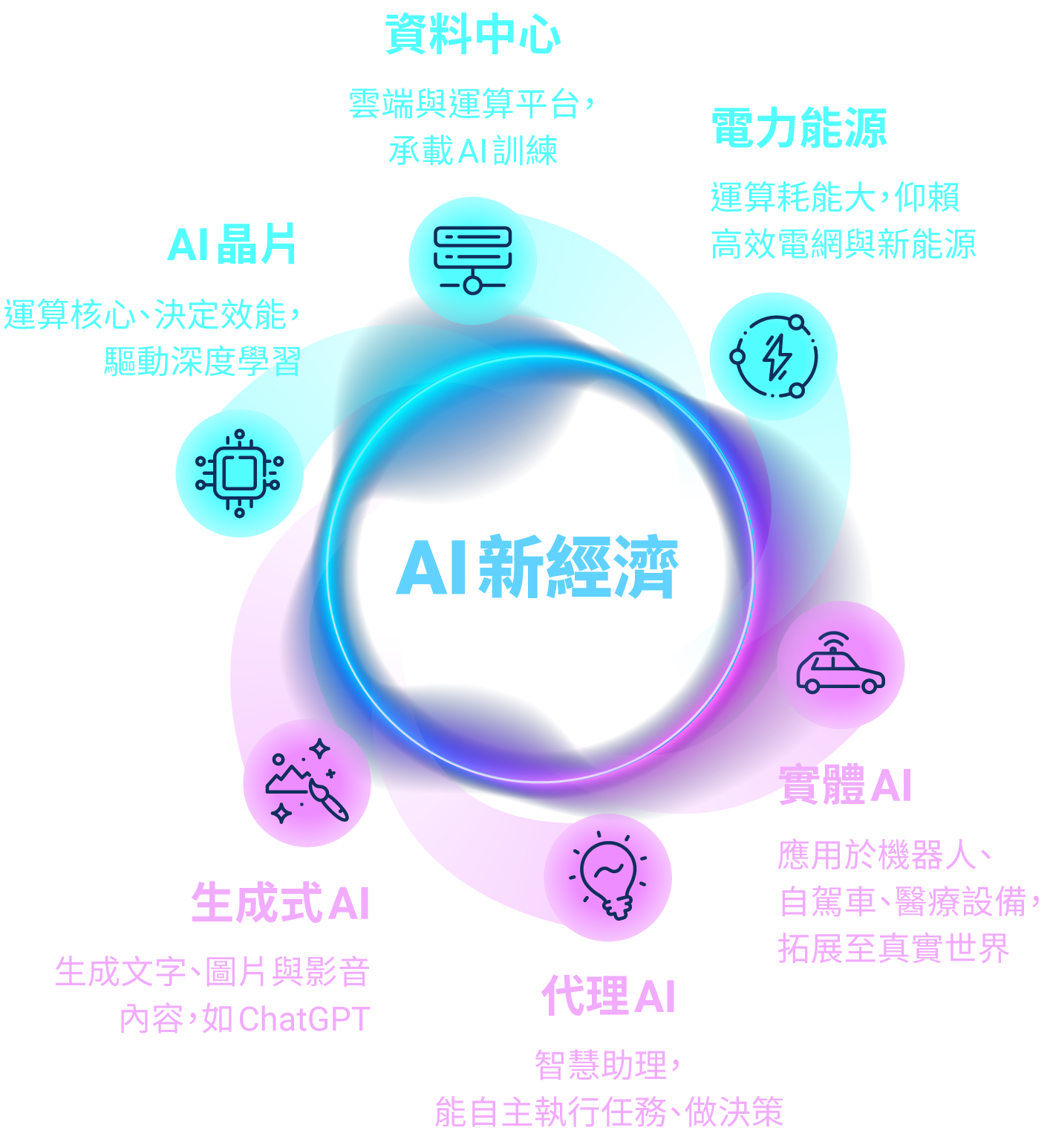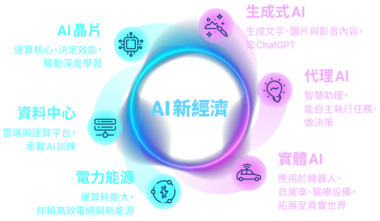 資料來源:彭博資訊,2025/9。本文提及個股、行業及占比僅為說明之用,不代表基金之必然投資,亦不代表任何金融商品的推介或建議,無特定推薦之意圖。本文提及之經濟走勢預測不必然代表本基金之績效,本基金投資風險請詳閱基金公開說明書。投資人申購本基金係持有基金受益憑證,而非本文提及之投資資產或標的。AI新經濟相關企業可能正處於成長初期,故有產業成長變化快速及產品或業務高度集中等特性而使本基金有潛在的類股過度集中之風險,經理公司將適度分散投資標的,惟風險無法因分散投資而完全消除,提醒投資人應留意本基金投資標的亦可能受到全球產業景氣循環等系統性風險影響,基金所投資有價證券價格漲跌及其他因素之波動將影響本基金淨資產價值之增減。