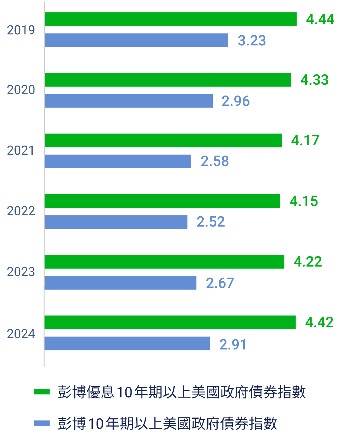 ICE、彭博資訊,2019/12-2024/12。ICE優息10年期以上已開發市場投資級美元公司債券指數資料起始日自2010/12/31,發布時間自2024/6/11。發布日前之資料為指數回測結果,不代表基金投資組合之實際報酬率及未來績效保證,實際表現可能與回測結果有所差異。基金或有因利率變動、匯率變動、債券發行機構違約不支付本金、利息或破產而將影響基金的淨值及利息,債券交易市場流動性不足而影響基金淨值下跌之風險。指數殖利率、票息率非指基金配息率,投資人不可直接投資該指數。本文提及之經濟走勢預測不必然代表本基金之績效,本基金投資風險請詳閱基金公開說明書。